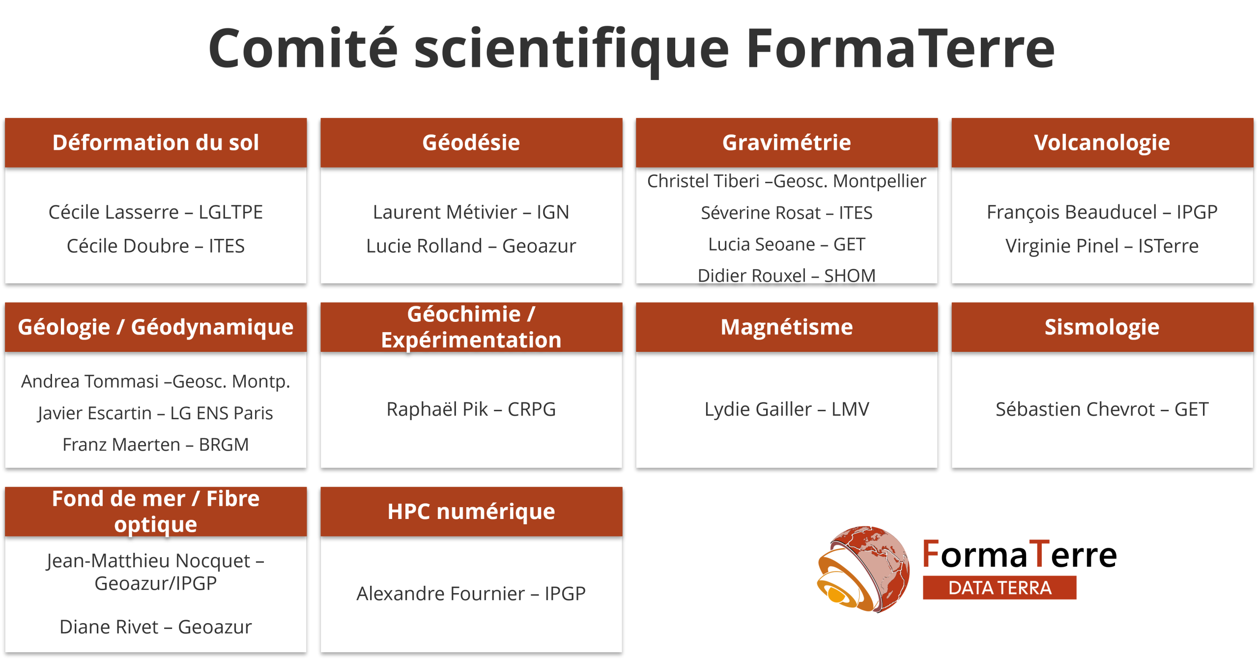FormaTerre est dirigé par un Comité directeur (CD) et conseillé par un Comité scientifique (CS). Les décisions sont mises en œuvre par un Bureau exécutif (BE) dirigé par le directeur du pôle: