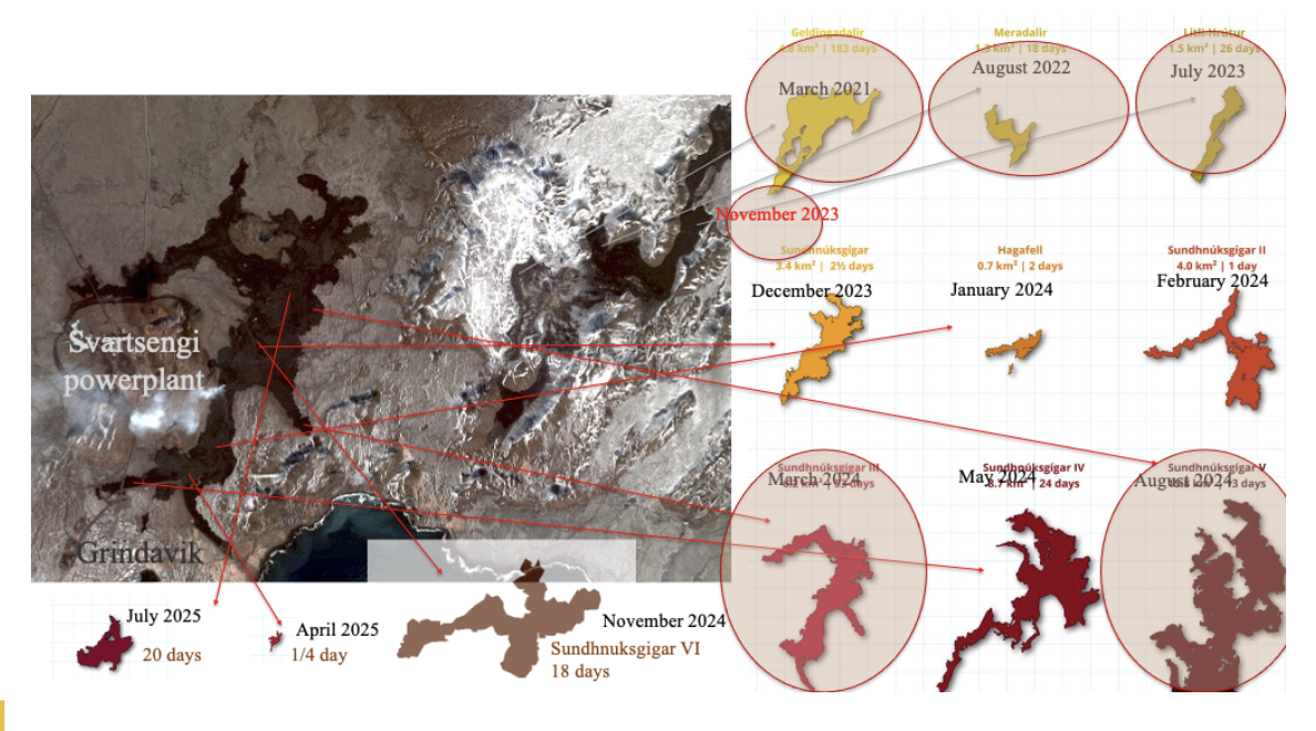 Les phases d’activité éruptives sur Sundhnúkarsgigar et Grindavík continuent jusqu’à la date de cet article (août 2025) avec un total, sur cette zone, de 9 éruptions (exemple de l’éruption de novembre 2024 sur la figure 3). Ces éruptions sont séparées par des périodes de repos de 1 à 4 mois qui restent néanmoins marquées par une forte sismicité et des déformations de surface. Environs 250 millions de m3 de lava ont été émis, soit l’équivalent en volume d’une centaine de piscines olympiques.