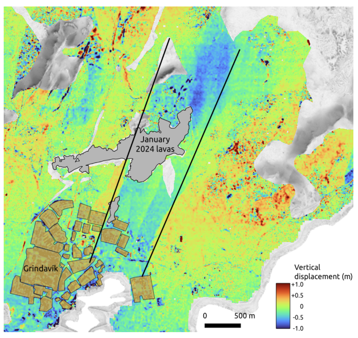 Néanmoins certaines images ont permis de quantifier la subsidence de surface induite par la progression du magma en profondeur ce qui est une information très utile aux autorités pour caractériser les dégradations dans la ville de Grindavik (Figure 2).