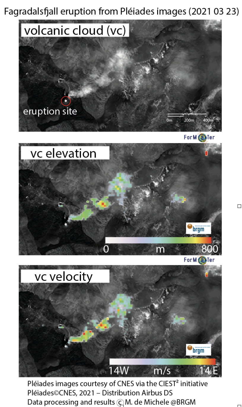 L’acquisition Pléiades du 23 mars 2021, a bien imagé ce panache. C’est ainsi que les chercheurs du BRGM, impliqués dans l’initiative CIEST², ont pu utiliser Pléiades pour extraire une carte des hauteurs et une carte des vitesses de ce nuage volcanique.